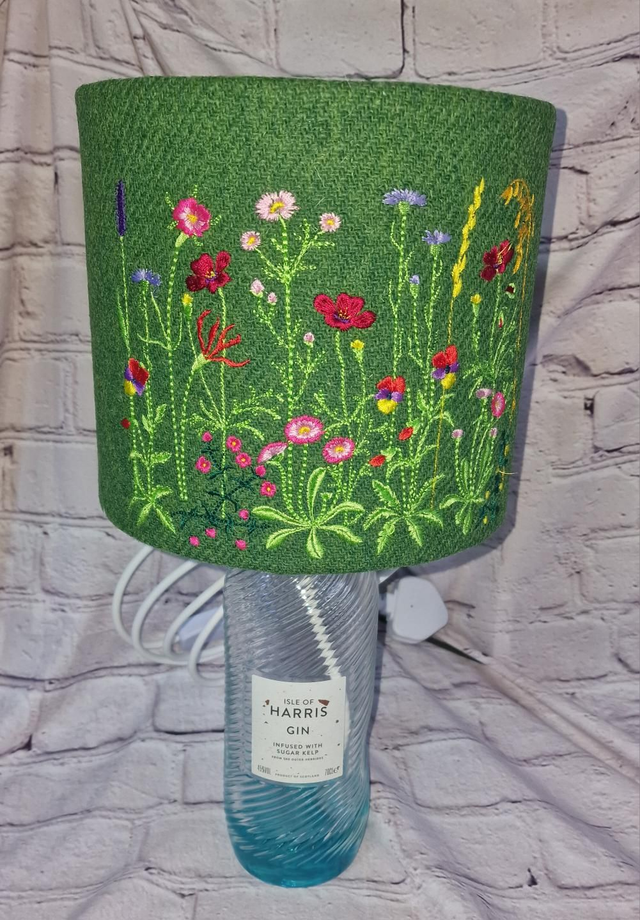 Harris Tweed lampshade with embroidered machair design. 20cms diameter shade.